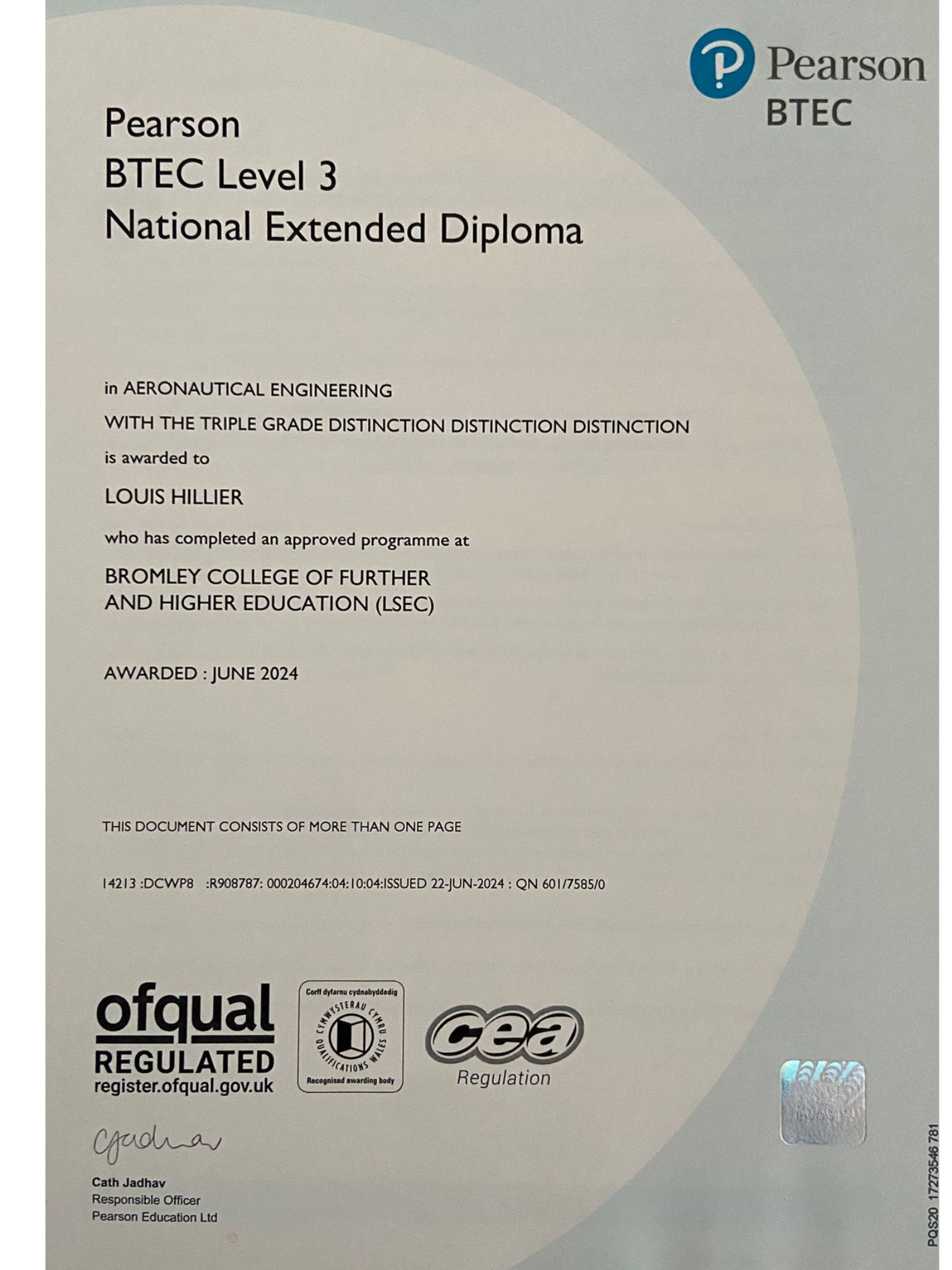 in Aeronautical Engineering with the triple grade Distinction Distinction Distinction